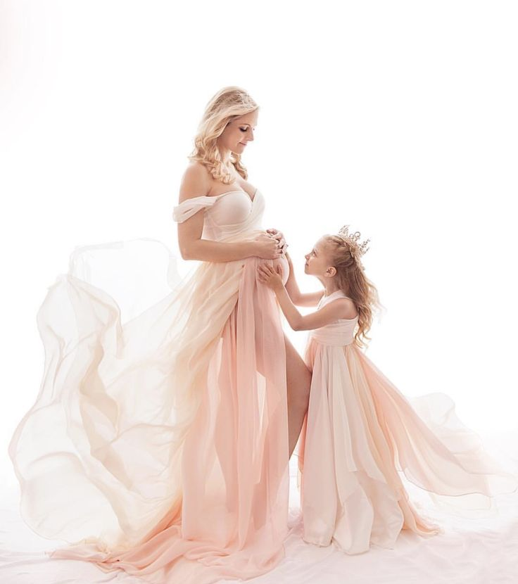 - Мама в длинном платье на природе или в студии с мягким светом.